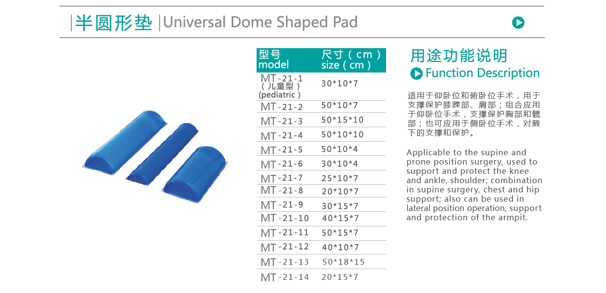 【產(chǎn)品用途】:適用于仰臥位和俯臥位手術(shù),用于支撐保護(hù)膝踝部、肩部;組合應(yīng)用于仰臥位手術(shù),支撐保護(hù)胸部和髖部;也可應(yīng)用于側(cè)臥位手術(shù),對(duì)腋下的支撐和保護(hù)